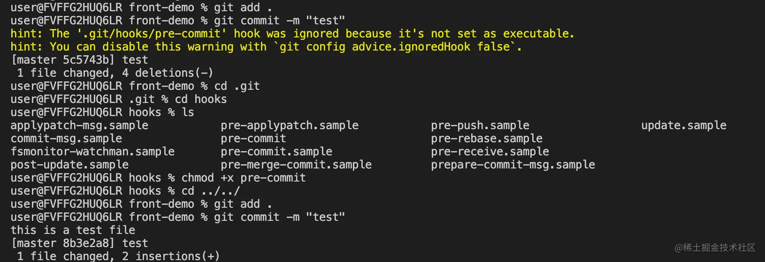 然后再次提交代码,发现git commit后,打印出了this is a test file,我们写在.git/hooks/pre-commit中的代码,这就说明Git Hooks触发了。