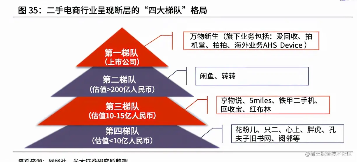 然而,并非所有二手电商行业玩家都有这个优势。光大证券按网经社资料整理,提出了二手电商的四大梯队,以上市和估值作为划分依据。玩家自动化水平和规模化质检能力的参差不齐,这导致各方无论是研发投入能力还是质检建设能力上,差距都逐渐拉大。