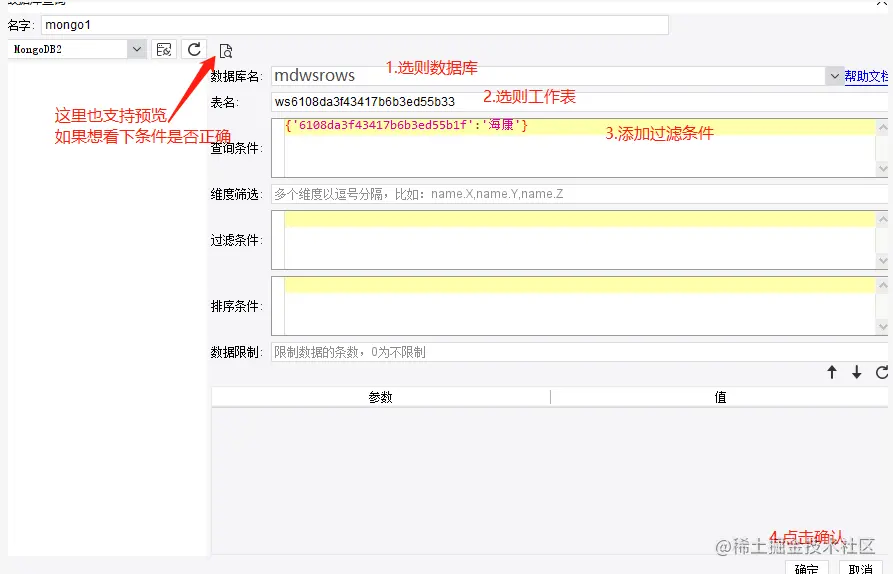 插件安装完毕后,点击设计器菜单栏的服务器>定义数据连接,新建一个MongoDB类型的数据连接,根据实际场景填写数据库连接信息,点击测试连接,弹出连接成功对话框后,点击确定保存即可。