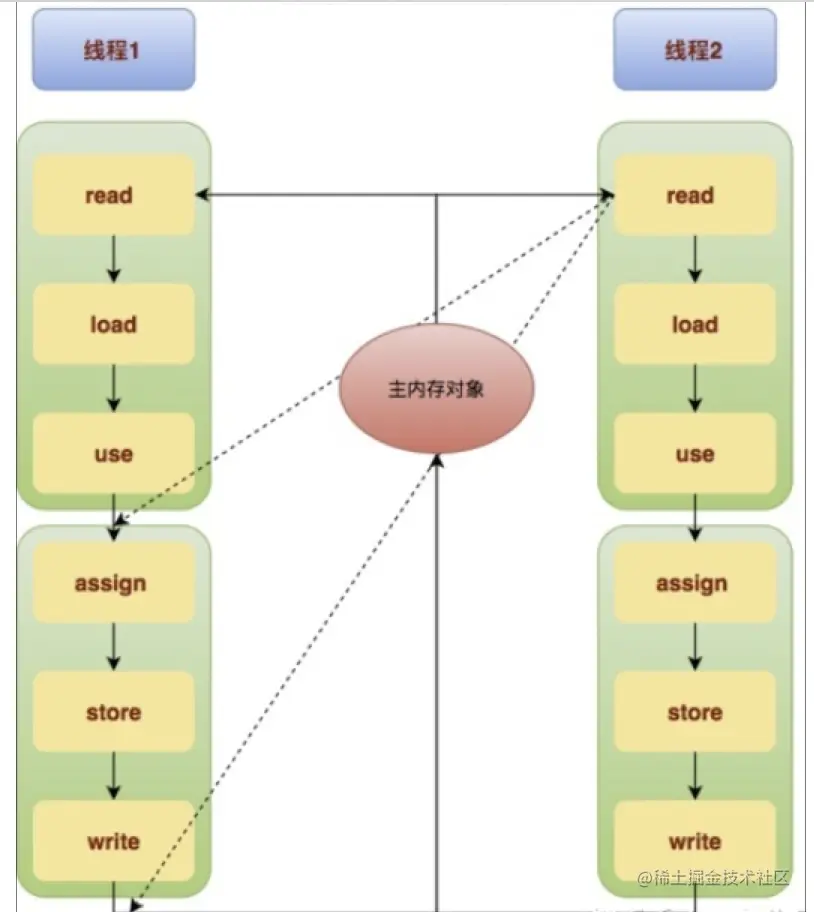 read(读取)→load(加载)→use(使用)→assign(赋值)→store(存储)→write(写入)→lock(锁定)→unlock(解锁)