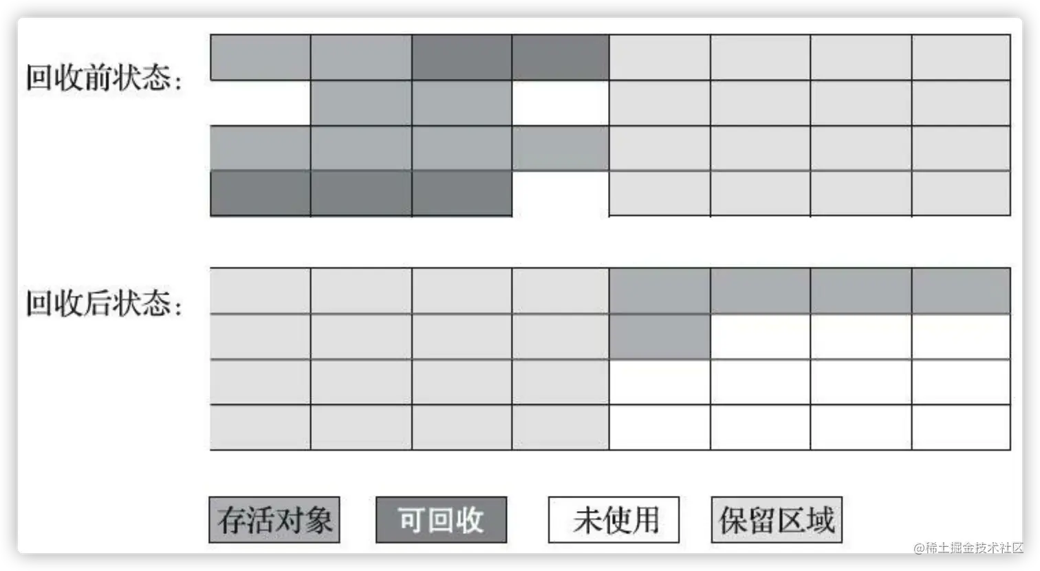 标记-整理算法的最终效果等同于标记-清除算法执行完成后,再进行一次内存碎片整理。