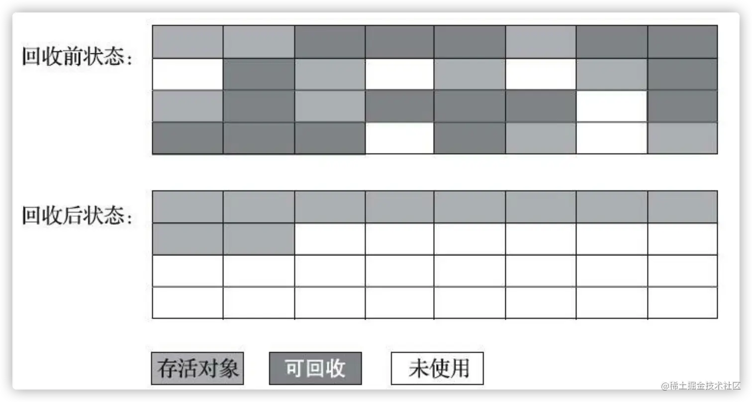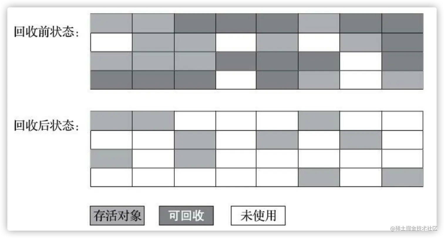 - 效率问题。回收的空间是不连续的,在对象的堆空间分配过程中,尤其是大对象的内存分配,不连续内存空间的工作效率要低于连续的空间。