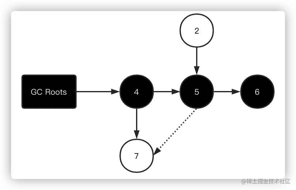对象5 和对象7之间是有引用关系的,如果在扫描途中,当扫描到对象5时,用户线程删除了这两者之间的引用关系(用虚线来表示取消了引用关系),转而将对象4和对象7关联起来。因为扫描是无法回头的,只能往下走,那么对象7就会被遗忘掉。