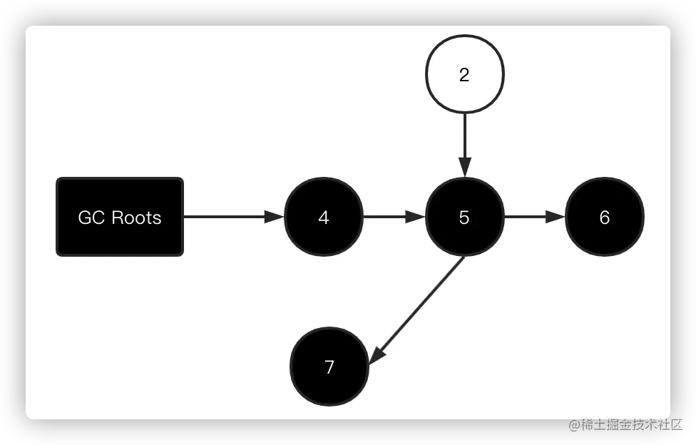 首先是初始状态,很简单,只有 GC Roots 是黑色的。同时需要注意下面的图片的箭头方向,代表的是有向的,比如下图有两条引用链是:根节点->4->5->6 以及 根节点->4->5->7,注意对象2不在根节点的引用链上。