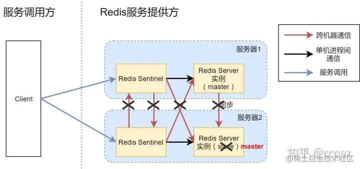 你可能会问,为什么Redis要有这个50%的设定?假设我们允许小于等于50%的Sentinel连通的场景下也可以进行主从切换。试想一下【异常3】,即服务器1和服务器2之间的网络中断,但是服务器本身是可以运行的。如下图所示:
