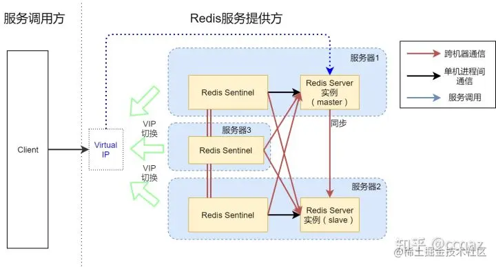 答案当然是肯定的。这可能就要引入虚拟IP(Virtual IP,VIP),如上图所示。我们可以把虚拟IP指向Redis Server master所在的服务器,在发生Redis主从切换的时候,会触发一个回调脚本,回调脚本中将VIP切换至slave所在的服务器。这样对于Client端来说,他仿佛在使用的依然是一个单机版的高可用Redis服务。