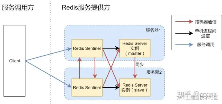 一般情况下,我们搭的个人网站,或者平时做开发时,会起一个单实例的Redis Server。调用方直接连接Redis服务即可,甚至Client和Redis本身就处于同一台服务器上。这种搭配仅适合个人学习娱乐,毕竟这种配置总会有单点故障的问题无法解决。一旦Redis服务进程挂了,或者服务器1停机了,那么服务就不可用了。并且如果没有配置Redis数据持久化的话,Redis内部已经存储的数据也会丢失。 方案2:主从同步Redis Server,单实例Sentinel