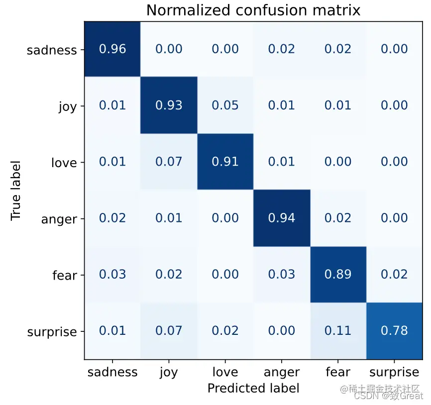 我们可以清楚地看到该模型错误地预测了一些标签。 另一方面,似乎有相当多的例子没有明确的类别,它们可能被错误标记或完全需要一个新的类别。 特别是,“joy”似乎多次被贴错标签。 有了这些信息,我们可以优化数据集,这通常可以带来与拥有更多数据或更大模型一样大的性能提升(或更多)!