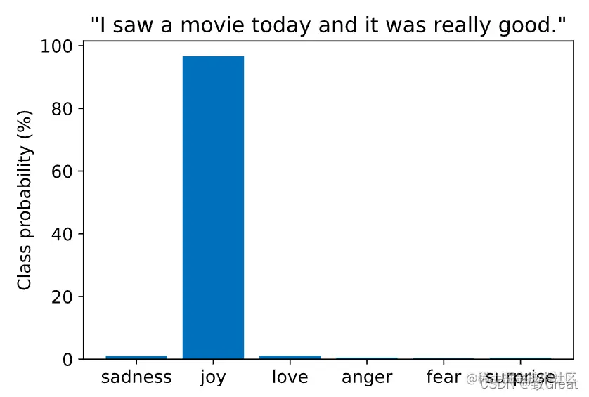 最后,我们可以在条形图中绘制每个类别的概率。 显然,该模型估计最有可能的类别是“快乐”,考虑到推文,这似乎是合理的: