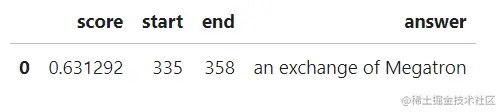 在问题回答中,我们向模型提供一段称为上下文的文字,以及一个我们想提取答案的问题。 然后该模型返回与答案相对应的文本跨度。 让我们看看当我们问一个关于客户反馈的具体问题时,我们会得到什么。