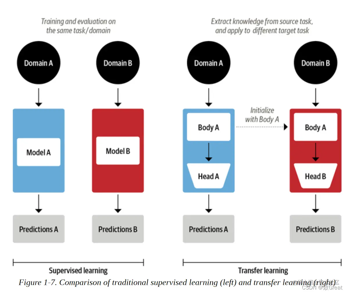 如今,在计算机视觉领域,使用迁移学习来训练像ResNet这样的卷积神经网络,然后让它适应或微调一个新的任务,是很常见的做法。 这使得网络能够利用从原始任务中学到的知识。 从架构上看,这涉及到将模型分成一个主体和一个头部,其中头部是一个特定的任务网络。 在训练过程中,主体的权重学习了源域的广泛特征,这些权重被用来为新任务初始化一个新的模型。 与传统的监督学习相比,这种方法通常能产生高质量的模型,可以在各种下游任务上更有效地进行训练,而且标注的数据要少得多。 这两种方法的比较见图1-7.