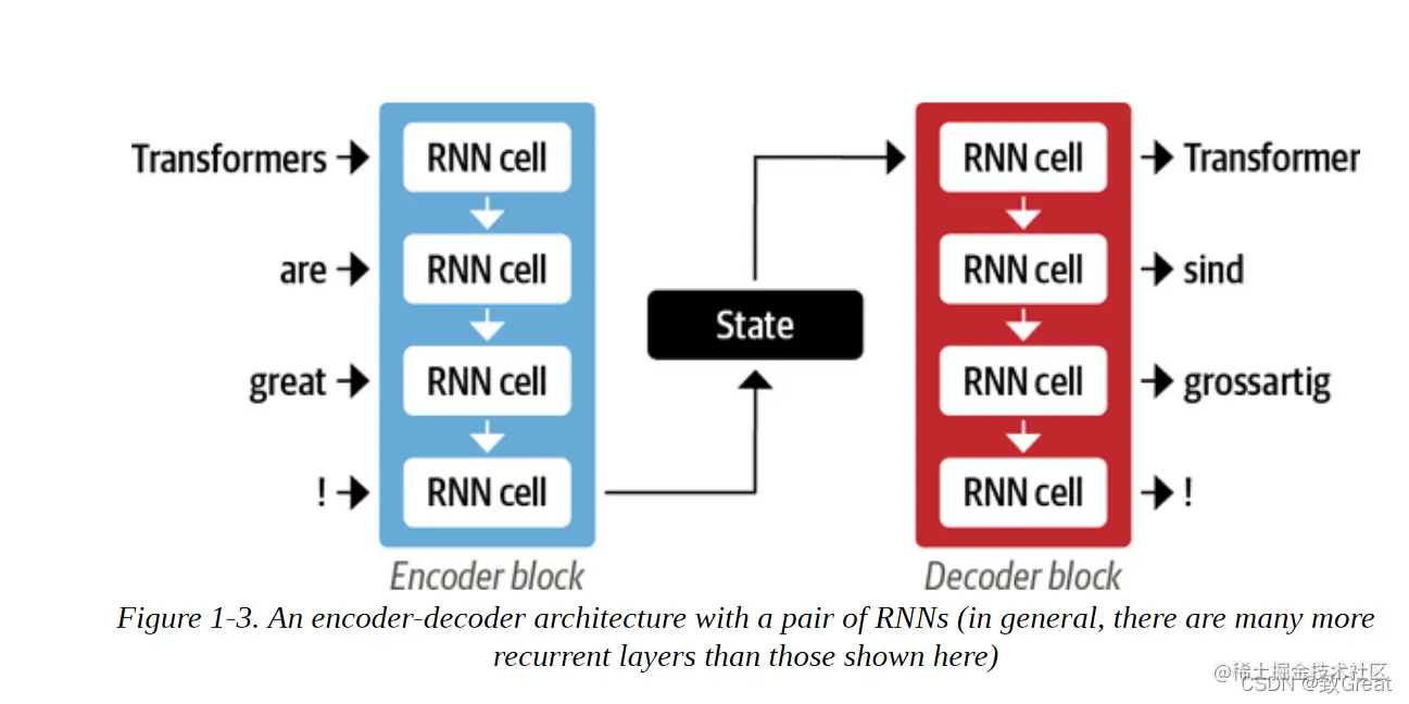 一般来说,编码器和解码器组件可以是任何一种可以为序列建模的神经网络架构。 这在图1-3中对一对RNN进行了说明,英语句子 "Transformers are great!"被编码为一个隐藏的状态向量,然后被解码以产生德语翻译 "Transformer sind grossartig!" 输入词被依次送入编码器,输出词从上到下逐一产生。