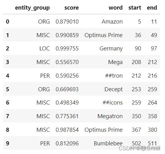 你可以看到,管道检测到了所有的实体,还为每个实体分配了一个类别,如ORG(组织)、LOC(地点)或PER(人)。 在这里,我们使用了aggregation_strategy参数,根据模型的预测对单词进行分组。 例如,实体 "擎天柱 "是由两个词组成的,但被分配到一个单一的类别。 MISC(杂项)。 分数告诉我们该模型对它所识别的实体有多大的信心。 我们可以看到,它对 "霸天虎 "和第一次出现的 "威震天 "最没有信心,这两个东西它都没能作为一个单一的实体进行分组。