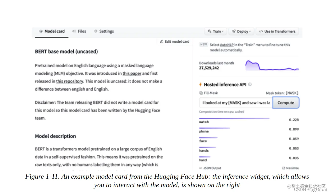 模型仓库还提供了模型和数据集卡片,以记录模型和数据集的内容,并帮助你做出明智的决定,确定它们是否适合你。 Hub最酷的特点之一是,你可以直接通过各种特定任务的交互式部件尝试任何模型,如图1-11所示。