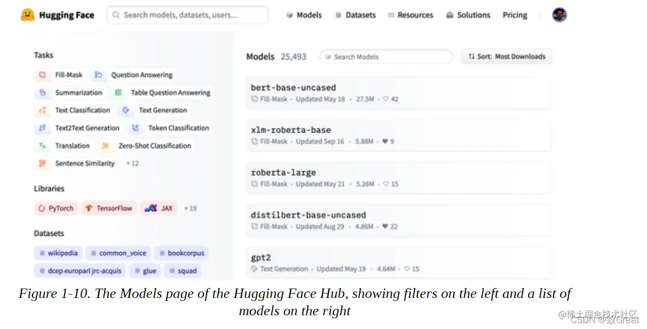 Hugging Face Hub承载了超过20,000个免费提供的模型。 如图1-10所示,有针对任务、框架、数据集的过滤器。 更多旨在帮助你浏览中心并迅速找到有前途的候选人。 正如我们在管道中看到的那样,在你的代码中加载一个有前途的模型,实际上只需要一行代码就可以了。 这使得实验广泛的模型变得简单,并允许你专注于你的项目的特定领域部分。