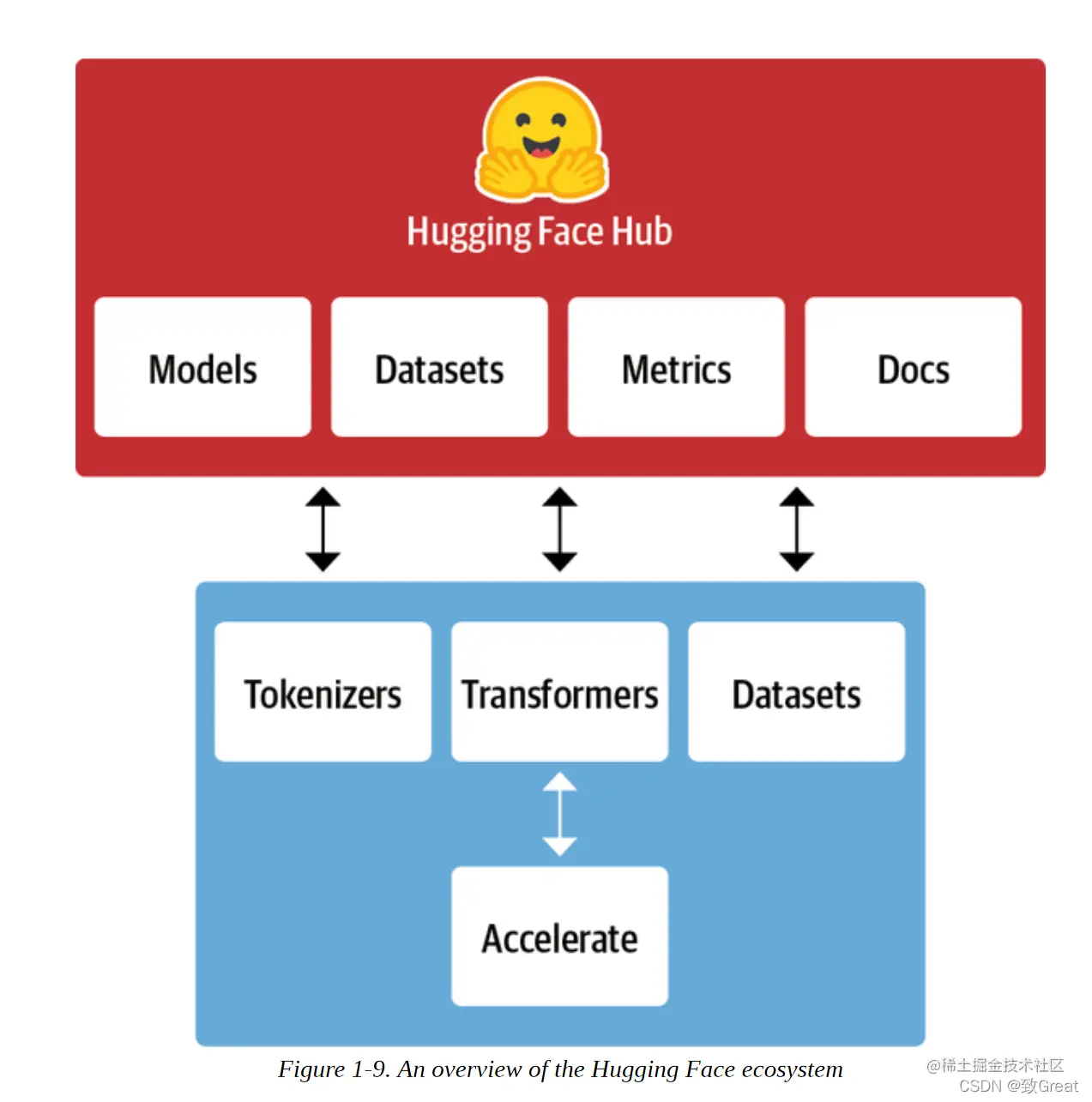 从 Hugging face Transformers开始,已经迅速发展成为一个由许多库和工具组成的整个生态系统,以加速你的NLP和机器学习项目。 Hugging face的生态系统主要由两部分组成。 如图1-9所示,一个程序库家族和Hub(模型仓库)。 程序库提供代码,而Hub提供预训练的模型权重、数据集、评估指标的脚本等。 在这一节中,我们将简要地看一下各种组件。 我们将跳过Transformers,因为我们已经讨论过了,而且在整个书的过程中我们将看到更多的内容。