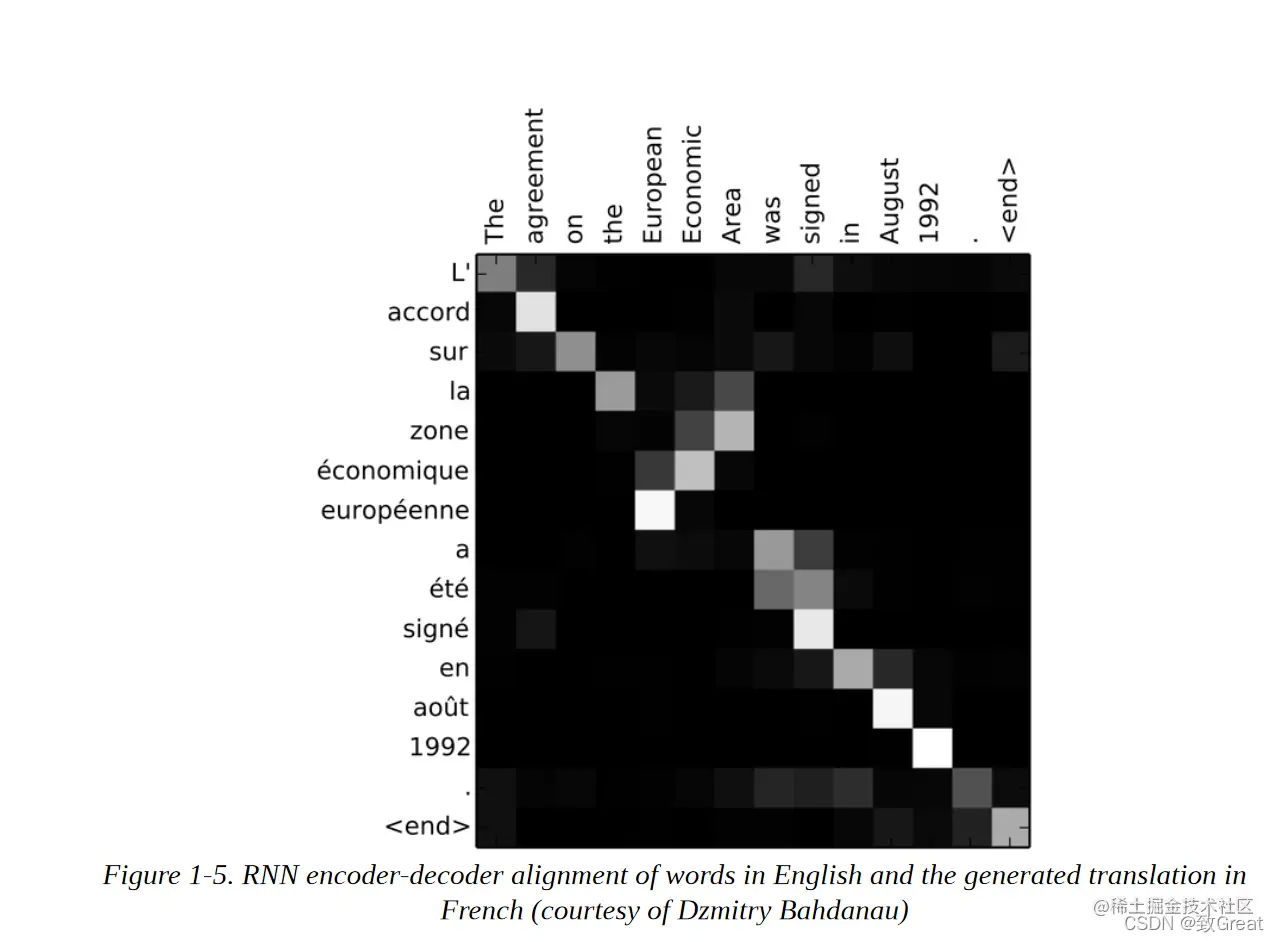 图1-5. 英文的RNN编码器-解码器对齐和生成的法文翻译(由Dzmitry Bahdanau提供)。