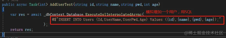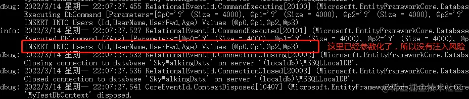 可以看到,SQL语句已经参数化了,所以是没有注入风险的。那到底是为什么呢?因为ExecuteSqlInterpolatedAsync中的SQL语句参数的类型是FormattableString,EF Core内部根据FormattableString结果,将对应的字符串生成参数化的SQL语句。