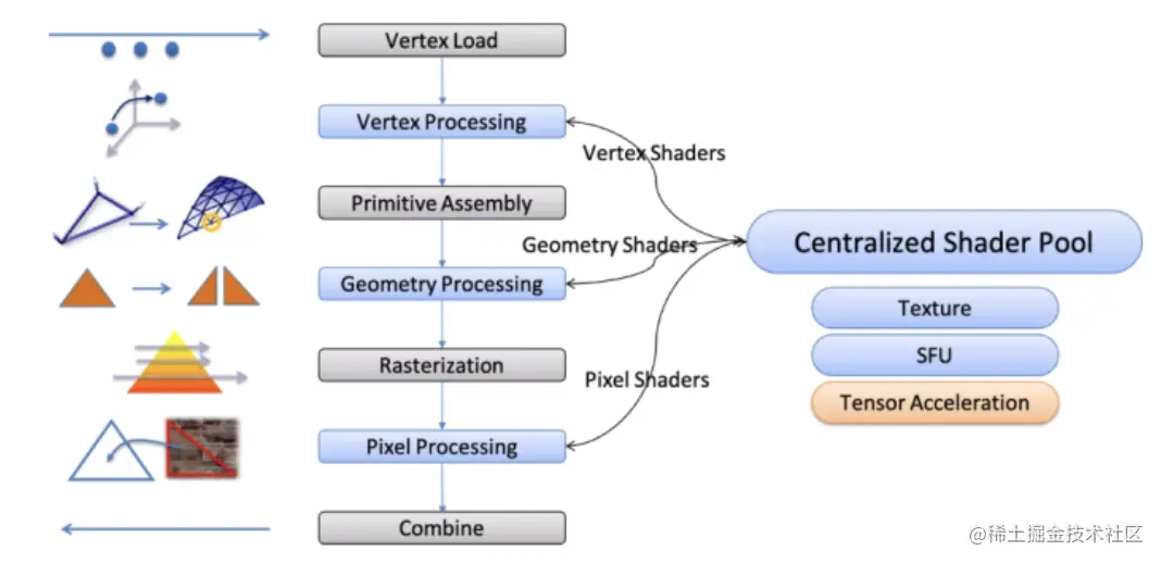 理论上讲,GPU是处理阶段的长长的线性管线(Pipeline)。不同类型的工作项(Work items)在通过管线时被处理。在早期,每个处理阶段都是一个固定的功能块,程序员对GPU的唯一控制就是调整每个区间的参数。