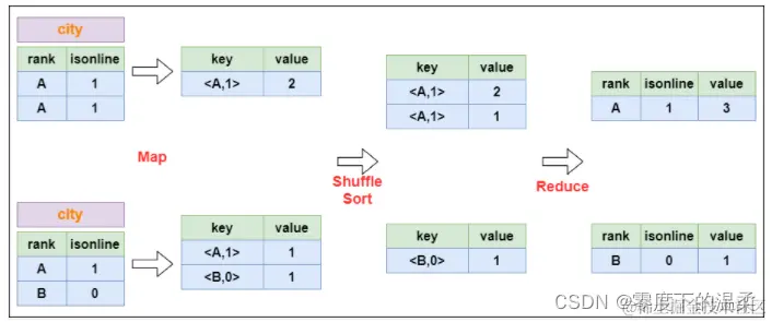 将GroupBy的字段组合为map的输出key值,利用MapReduce的排序,在reduce阶段保存LastKey区分不同的key。MapReduce的过程如下: