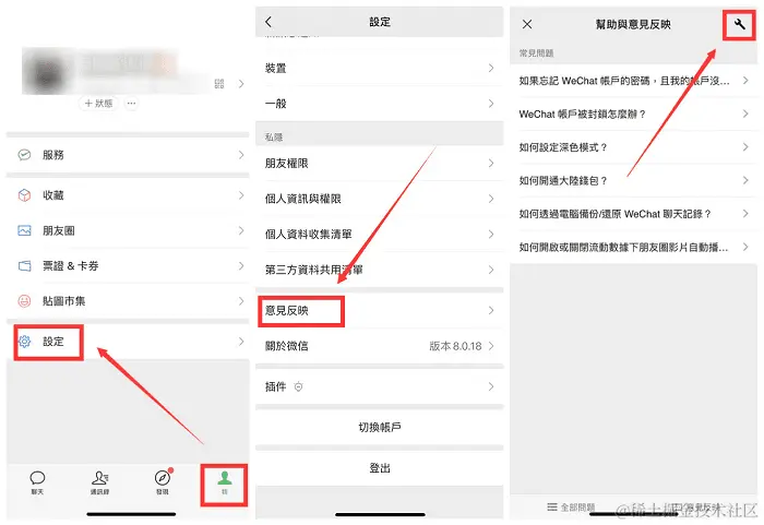 步骤一: 点击手机微信里右下角的“我”,接着点击“意见反馈”,再点击右上角的小工具图标。