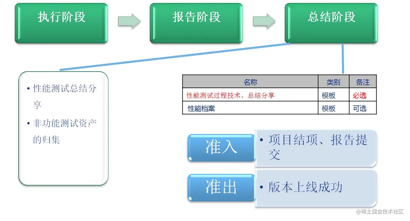 性能测试流程分为五个阶段,分别是【需求调研阶段】→【测试准备阶段】→【测试执行阶段】→【测试报告阶段】→【测试总结阶段】。