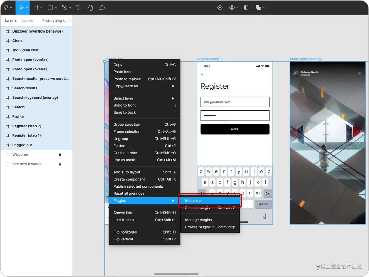 插件安装好后,选择Figma当前页全部画板,右键选择Plugins>Mockplus,点击上传,即可将Figma设计稿一键上传至摹客协作平台进行备份。