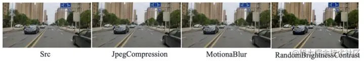 2、为了提高模型的泛化能力,针对车载摄像头的场景,在训练全过程中随机加入albumentations库中的JpegCompression(降画质) 、MotionaBlur(运动模糊)、RandomBrightnessContrast(亮度对比度)等数据增强的方法。