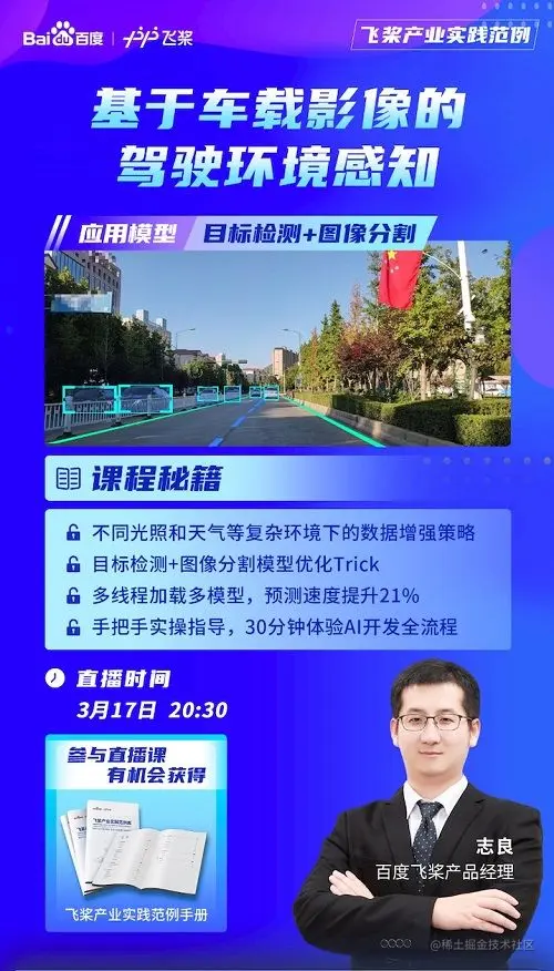 为了让小伙伴们更便捷地实践和应用驾驶环境感知,百度飞桨产品经理将于3月17日20:30-21:00为大家深度解析从数据准备、方案设计到模型优化部署的开发全流程,手把手教大家进行代码实践。