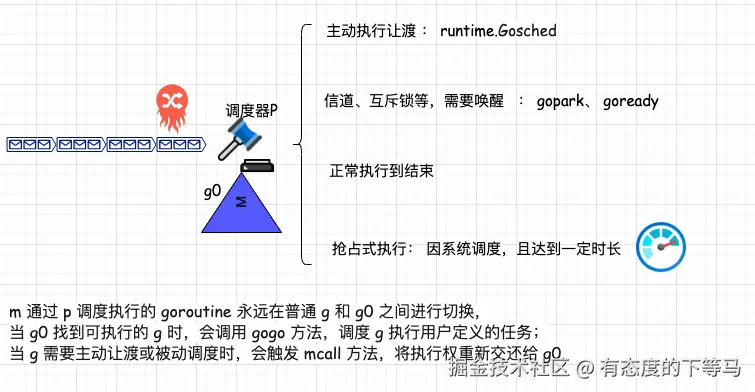 这个调度的功能被委托给了一个叫做g0的特殊的 goroutine, g0 是每个 OS 线程创建的第一个goroutine。