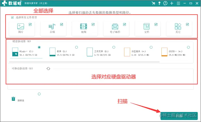 主要操作:首先进入数据蛙数据恢复专家(www.shujuwa.net/shujuhuifu/ )后跳过注册,其次这一步我们需要对文件类型和文件路径进行选择。选择文件类型推荐是全部都选上的,因为发现这样的话所扫描出来的结果会比较全面一些;那么文件位置的话自然是以实际为准了,选择你丢失数据的硬盘驱动器即可!最后点击“扫描”。