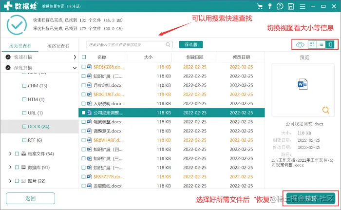 最后一步:在扫描结果中找到自己所需的丢失数据,然后我们可以通过视图的切换来看一下文件的详细大小等信息,最后确认选择(勾选)好自己需要恢复的数据后点击“恢复”!