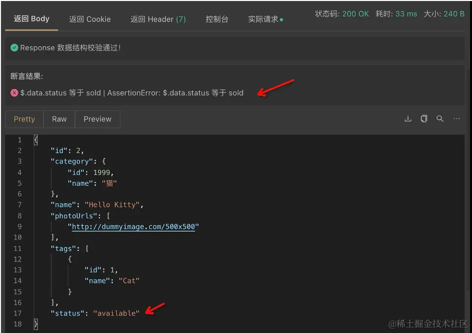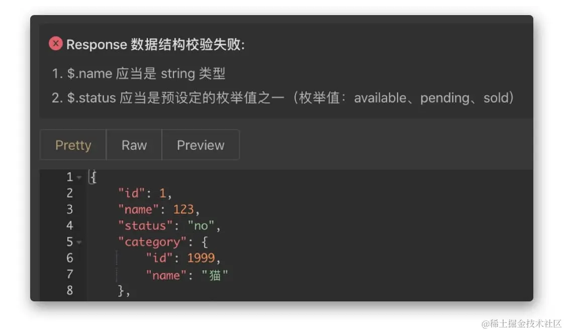 使用 Apifox 调试接口的时候,系统会根据接口文档里的定义,自动校验返回的数据结构是否正确,无需通过肉眼识别,也无需手动写断言脚本检测,非常高效!