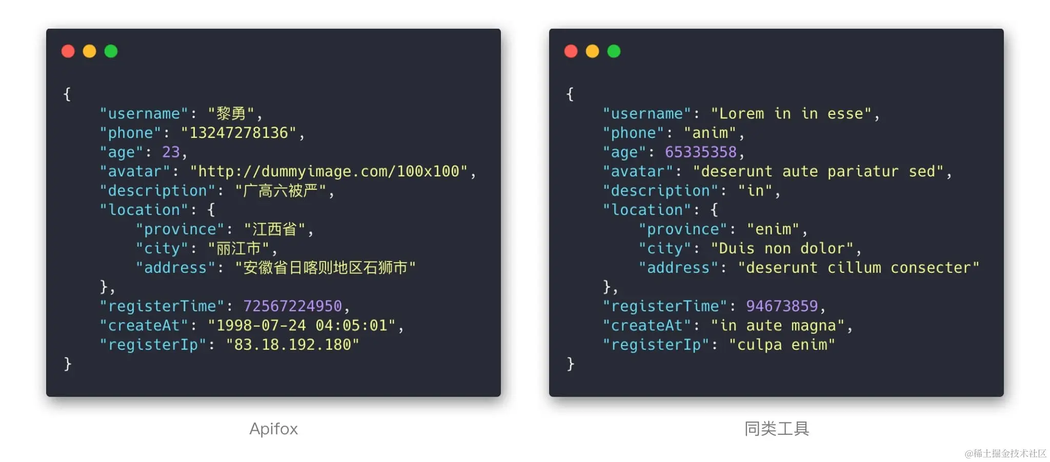 先放一张图对比下 Apifox 和其他同类工具 零配置 mock 出来的数据效果: