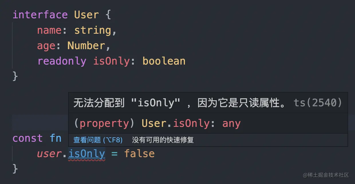 有些时候,我们想要一个属性变成只读属性,在typescript只需要使用readonly声明,如下: