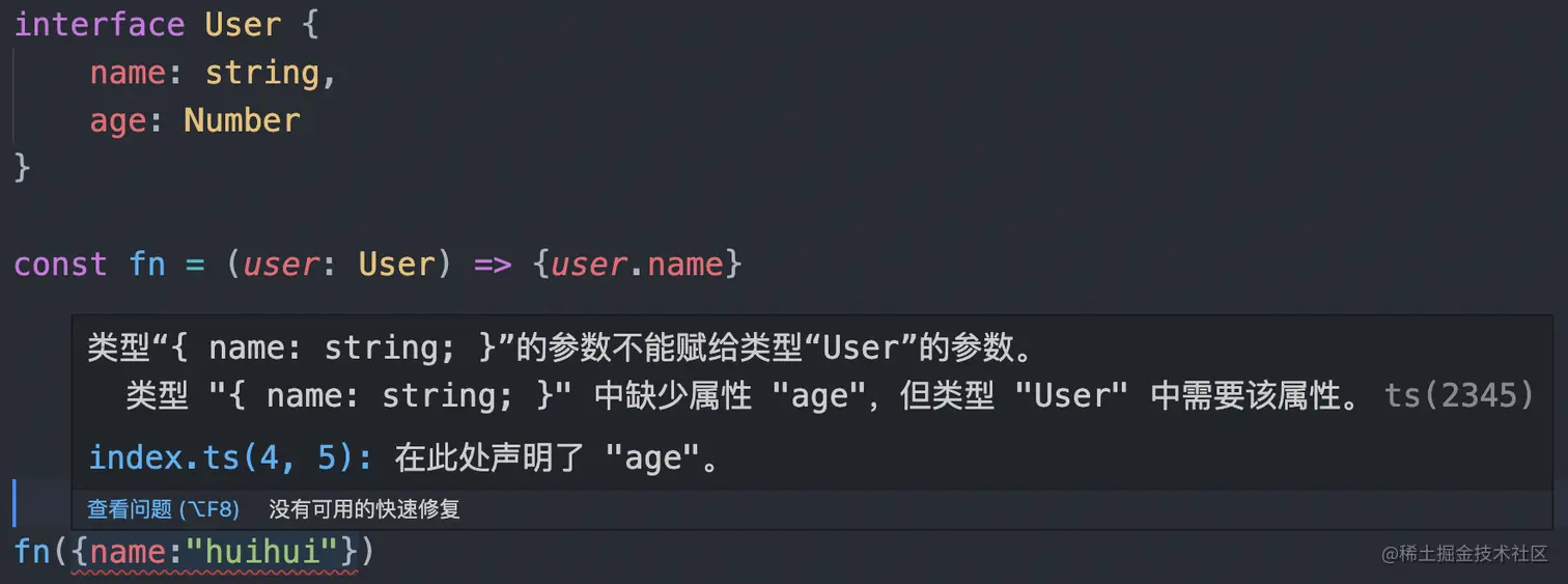 这些属性并不一定全部实现,上述传入的对象必须拥有name和age属性,否则typescript在编译阶段会报错,如下图: