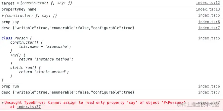 上述可以看到,当装饰器作为修饰类的时候,会把构造器传递进去。 constructor.prototype.age 就是在每一个实例化对象上面添加一个 age 属性