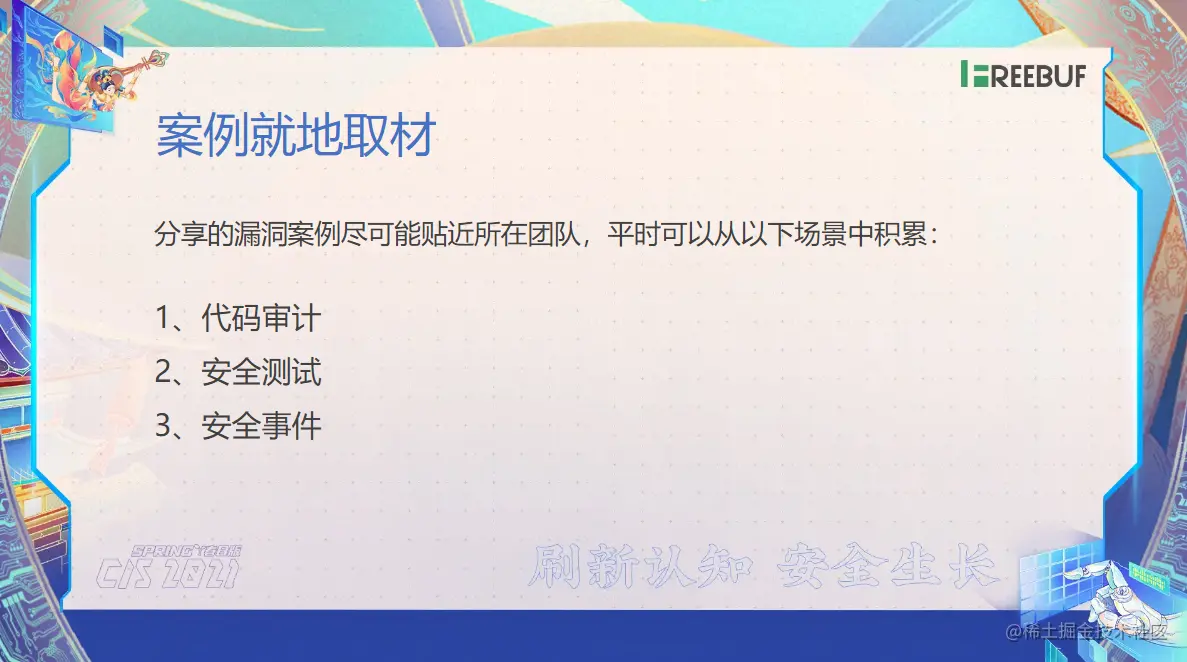 第一个说你在平时做代码审计的时候,你把这些案例了给存起来,截好图。然后把敏感信息的打个码。但是把意思大概说明白,把这些案例给整理起来。第二个就是从安全测试当中,我们每一次业务要上线了,肯定会有一轮安全测试,把业务测试当中发现了一些问题点,也可以整理起来,我们是有一个案漏案例库的。第三个就是漏洞事件了。那比如说一些通用型的一些漏洞事件,像那个 2021 年年末的时候,是不是有个 logic4 的这样一个组件,我记得在快过年的前几天了,那个时候出了一个命令执行的漏洞,那影响范围还蛮大的,那可以把这些事件了给它整理一下。你可以告诉他说你依赖了一些组件了,要及时升级。如果了你要引用一个组件了,你要最好查一下它的版本有没有漏洞,有漏洞的话你就不要使用了。