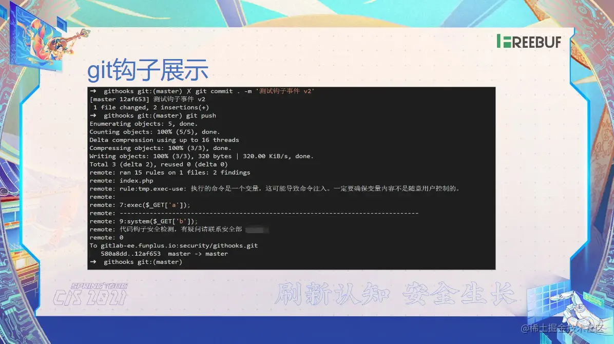那这里我给大家展示一下这个钩子了,它会是一样一个什么样效果?比如说我在命令行当中,我输入了一个 git commit 然后提交这个代码,然后在推送的时候它就会触发。那么在推送的时候,我们可以看到他这边告诉我哪个文件。那么它的行号,当中有个 EXEC 执行了这个 git 当中的 A 这个变量,那么它有可能会导致一个命令注入,那一定要确保内容不是用户随意控制的。那么这样一个提示性的话语,那具体了你可以去把这个界面了给它优化一下也可以。