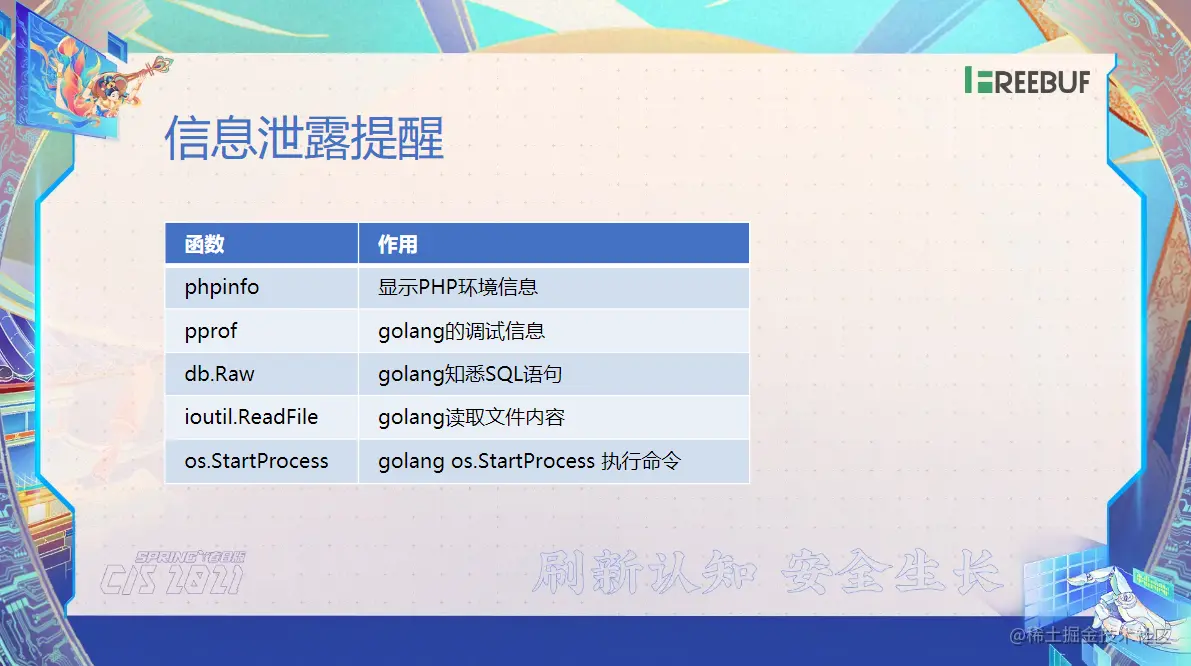 你都可以放到你的这个安全风险提醒里面去。我觉得优先级了,你可以把这些高危的了给大家放进去。比如像 FTP 的,你可以看情况,你放不放都行。那像 pprof 了,我觉得你肯定得注意。那 PP info 里面还是有蛮重要的信息的以及 Golang 里面的,它直接使用了裸写了这个语句以及读取文件内容以及执行系统命令的这些危险函数了,你都给它去提醒一下。