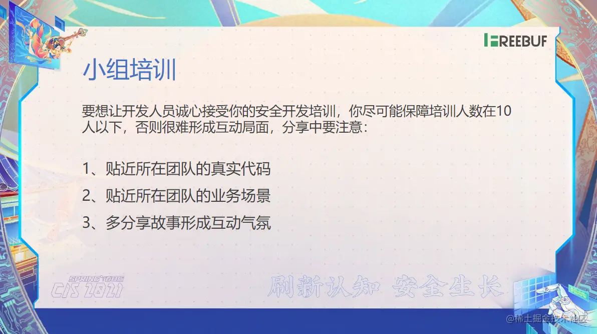 说了你要有这个时间的一个意识,你不要一直讲,讲完之后翻其他人压根就没来听,你要有以这样一个互动机制。那这里有三点了,我需要给大家去说的。就第一个了就是开始讲到了,你一定要贴近这个团队的一个真实代码。你每次给他做培训的时候了,你得先把她代码审计一遍,审计完了多多少少可能会有一些安全问题,或者说有些不规范的问题。你拿着这个代码去跟他说,你不要直接上来,对案例那样不是不好的,很多人可能就不乐意听。那么第二个就是要贴近他的业务场景,刚才也讲到了,那做 TCP 的你给他讲 HTTP 他不乐意听他,我压根就没有这个业务,你给我讲啥呢?第三个就是多分享故事的一个形式去形成一个互动的气氛。比如说你在给他做培训的时候,你给他讲越全的时候,那你就讲以前了,可能你挖过某个网站的一个预存漏洞,你是怎么发现的,以及你可能在网上了看到过别人的一些案例,那这些分析步骤了你可以给他讲一下。