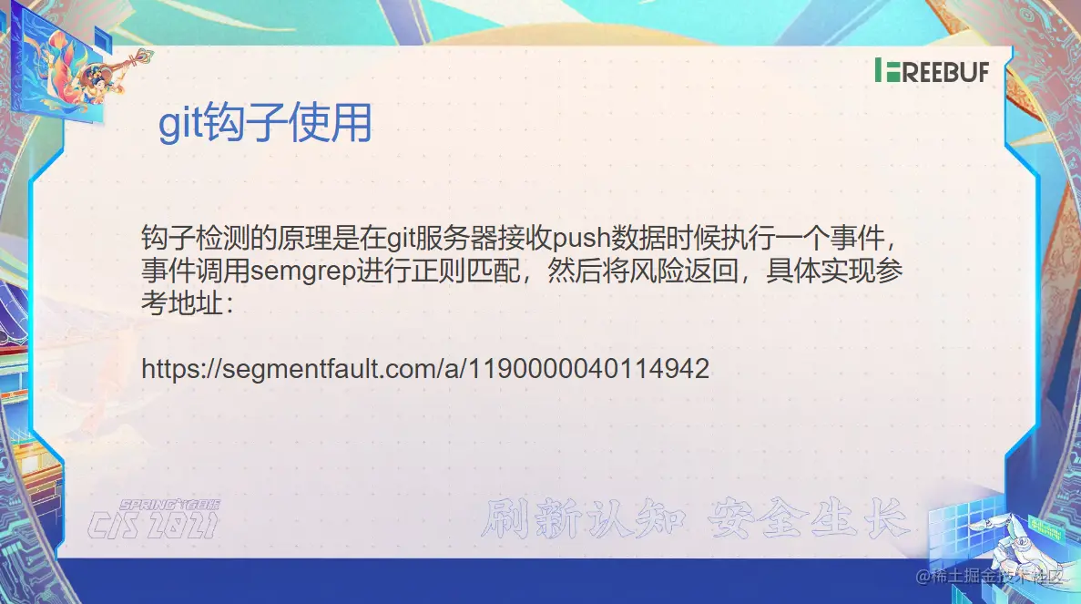 第三个就是我们告诉你了,你不能怎么去写,你应该怎么去写。那么我们制定完这一套规则了,我们不可能说其实人工去盯着您得有一套监督机制。这里我也会给大家去讲一下,怎么去结合semgrep 和GitLab做一个钩子事件,实时检测这个代码当中的一些风险点。