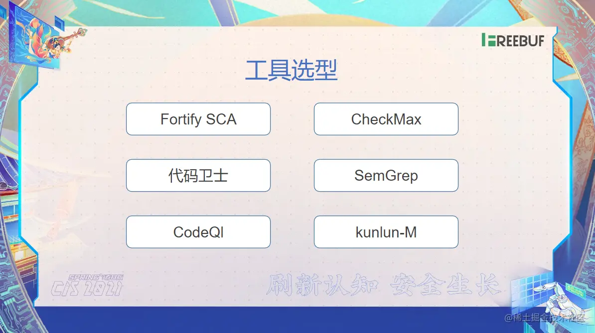那么这个时候呢您得借助一些第三方的一些工具去分析出来。说到这个代码审计的一些工具选型了,目前前这些我大部分都用过,比如说 fortify ,用的是比较熟练的。那么 check max 了这一款工具了,我还没用,因为还没有买他们的第三款这个代码卫士的话是那个奇安信的。那这一款我倒是用过一段时间。