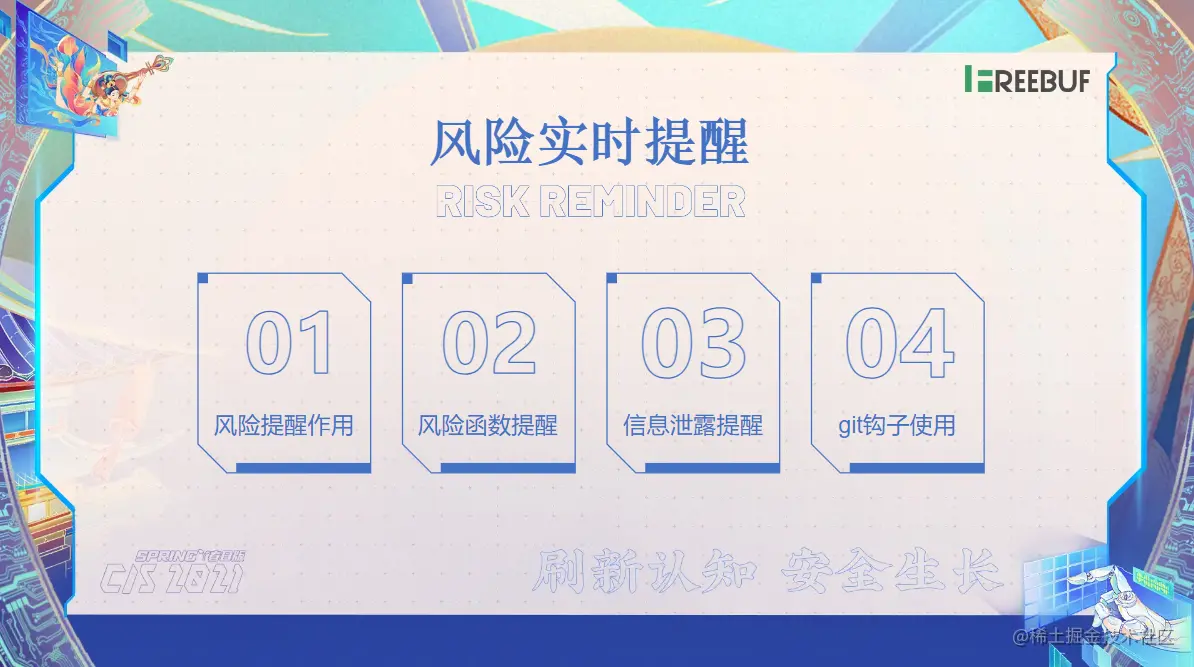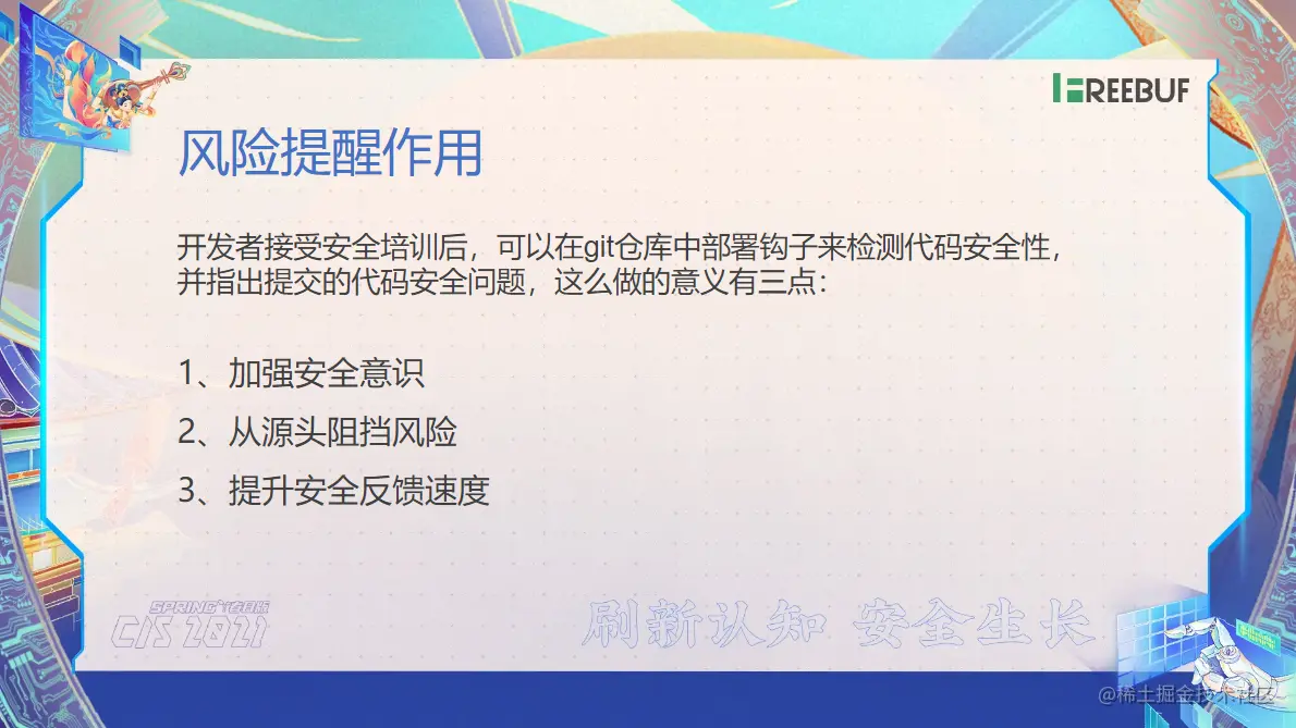 那接下来我们要讲的就是风险实时提醒。那么我们给他做完培训之后,我们有这个首次培训,也有这个每个季度一次培训,也有这些案例的一些讲解对吧,我们还得有这个监督的一个作用,就是他们写完代码之后,我们得及时去提醒他,以及了我们每一个季度了我们有一次全面扫描等等这些信息。