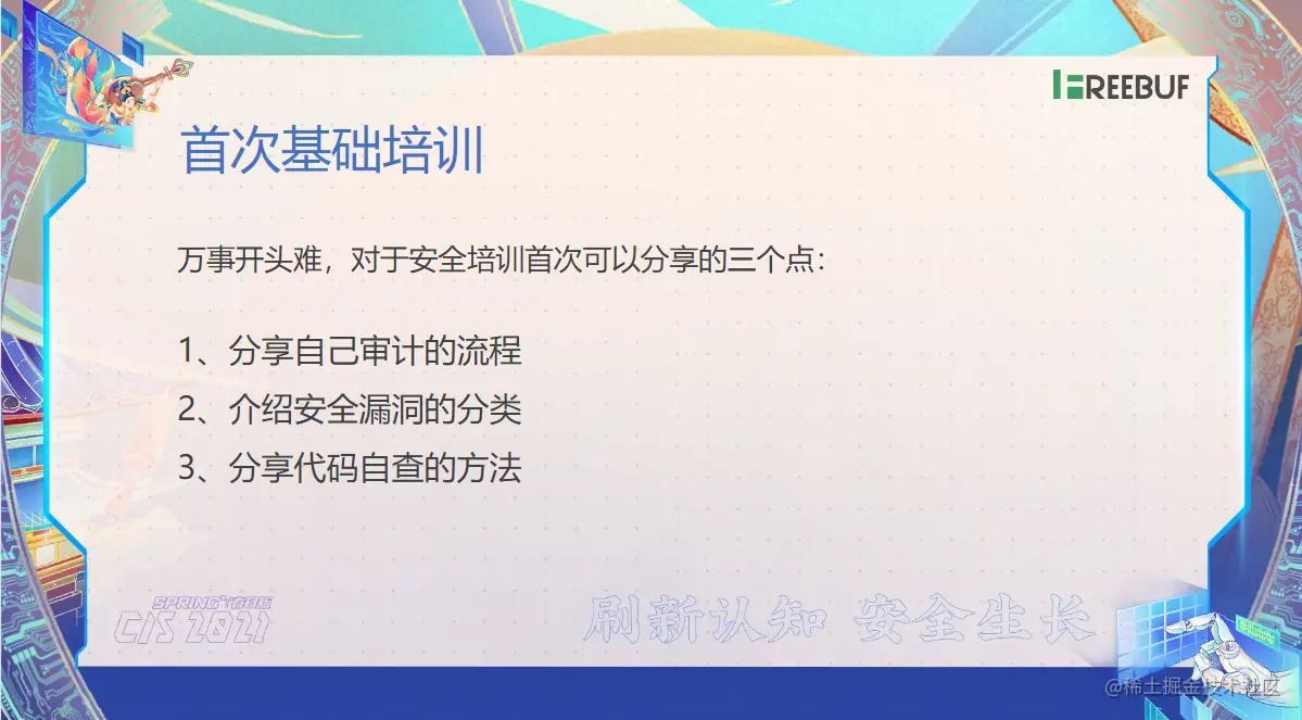 首次基础培训了我们可以给他讲哪些东西了?我觉得你首先可以给他讲一下你在这个甲方安全当中了,你是怎么去给他们做代码审计的,你是怎么去做安全的?这个其实是她比较关心的,让他了解你的工作。那你平时会关注哪些点,你给他充分交流一下。那么建立一个互信机制。