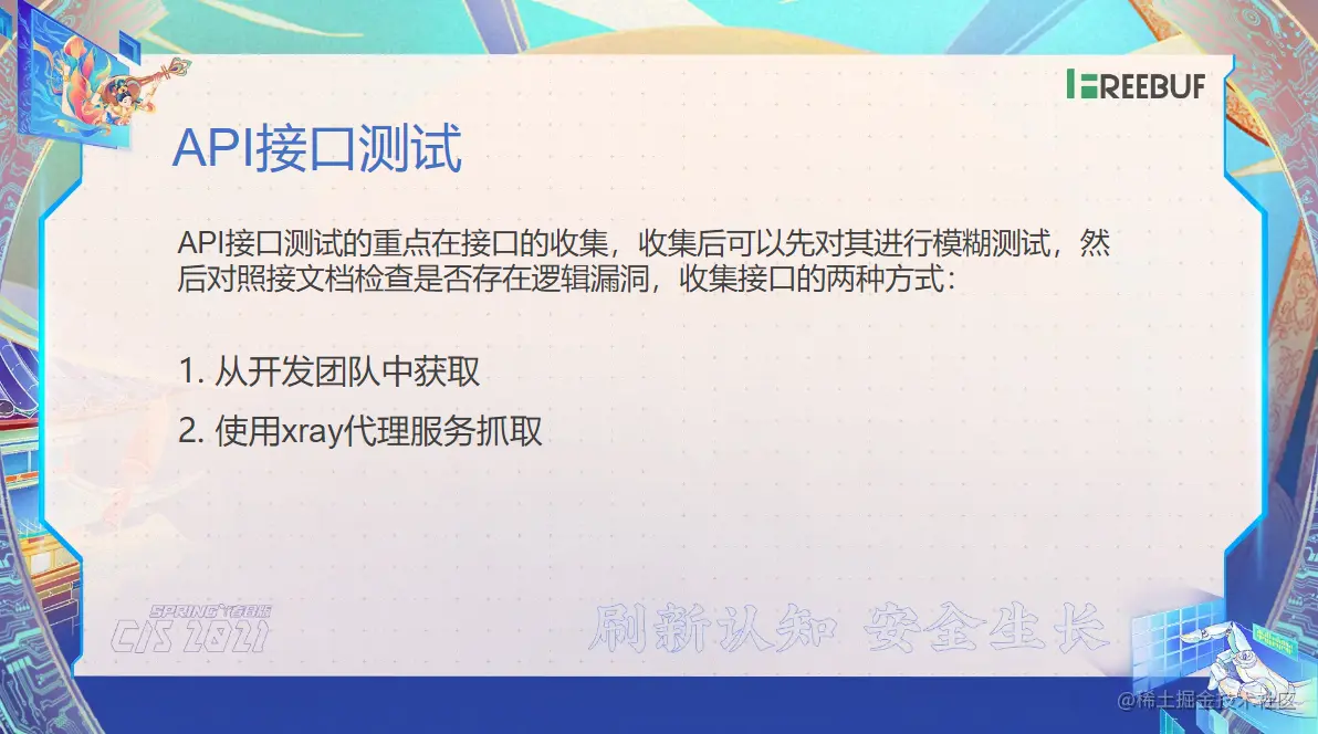 那传统的外部站点测出来是最简单的,无非就是先收集地址,然后测试一下常规有没有问题点,然后对这个业务功能进行测试一下。那业务功能也就是说我越权支付,然后用户密码找回验证码等等。好 API 接口了。那主要就是我们要把地址先拿到,拿到地址之后其实其他的测试方法都差不多。那么拿了这个地址了,我们有两种方式。第一种说从开发团队那边直接拿到一份 API 该的一个列表,然后并且搞得清楚他们每一个参数是做什么用的。然后对这些接口了去进行一些扫描测试以及一些逻辑性测试,和传统概念区别不大了。