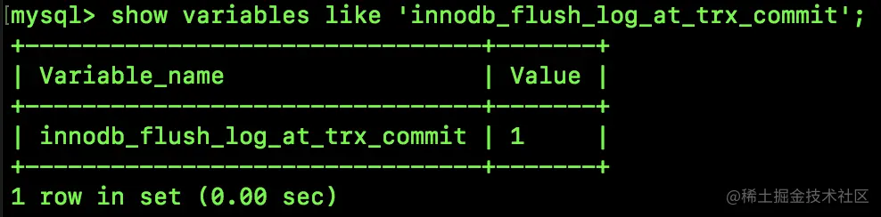 通过 innodb_flush_log_at_trx_commit 参数来控制持久化时机,该参数默认值为 1,如下图: