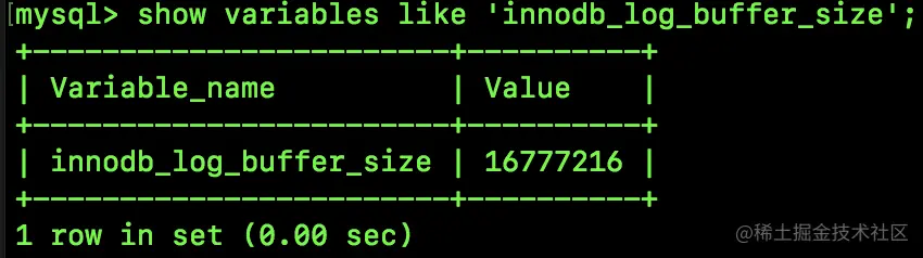 可以看到,这个 redo log buffer 大小刚好是 16MB,如果你觉得这个值有点小,也可以自行修改其大小。