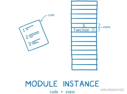 之后,模块记录需要转化为模块实例(module instance)。一个实例包含两个部分:代码和状态。