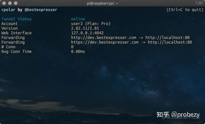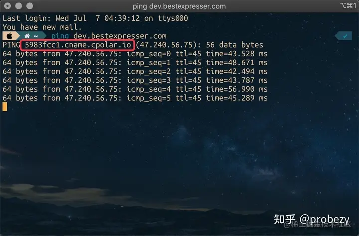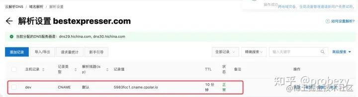 - 大约5-10分钟后,ping您的自定义域名(dev.bestexpresser.com),看是否已经解析到了cpolar提供cname地址